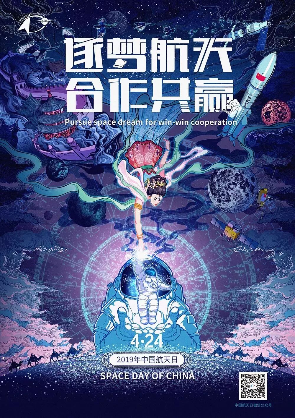 对于最终使用的宣传海报,评审专家认为,该作品以插画手法,通过嫦娥飞天、航天员等元素,诠释了中国传统文化和航天现代科技的融合,象征着中华民族千百年来纵贯古今的航天梦,很好地揭示了“逐梦航天 合作共赢”这一主题。