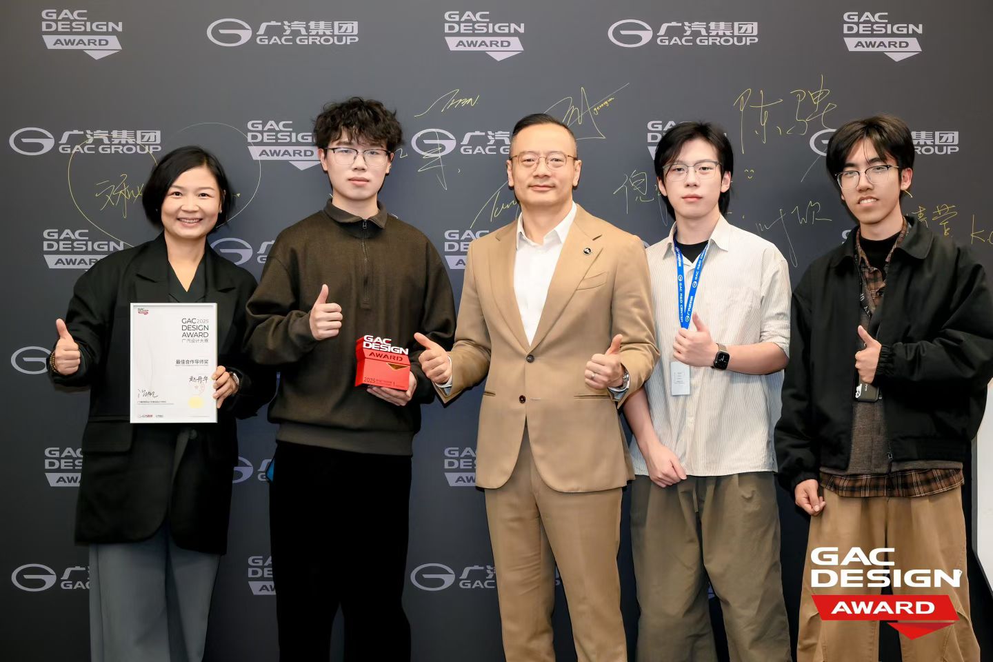 广汽研究院副院长张帆(中)与湖南大学设计艺术学院赵丹华教授(左1)、25级硕士研究生陈骋(左2)、22级本科生黄磊(右1)合影。