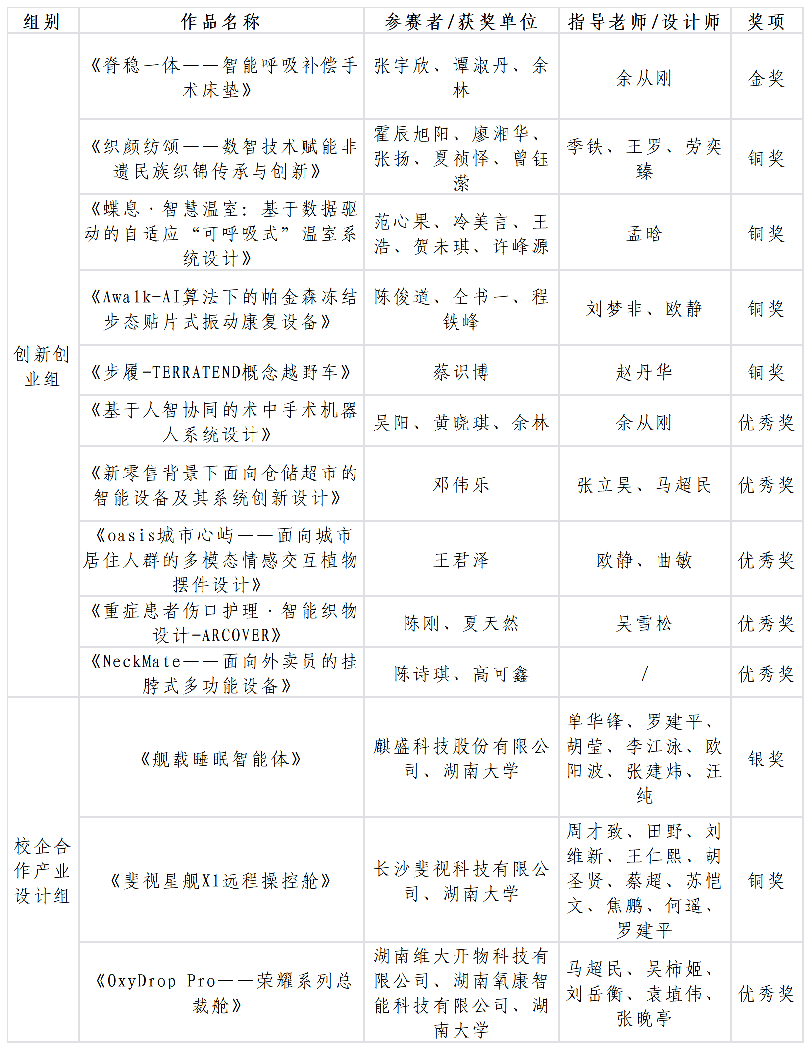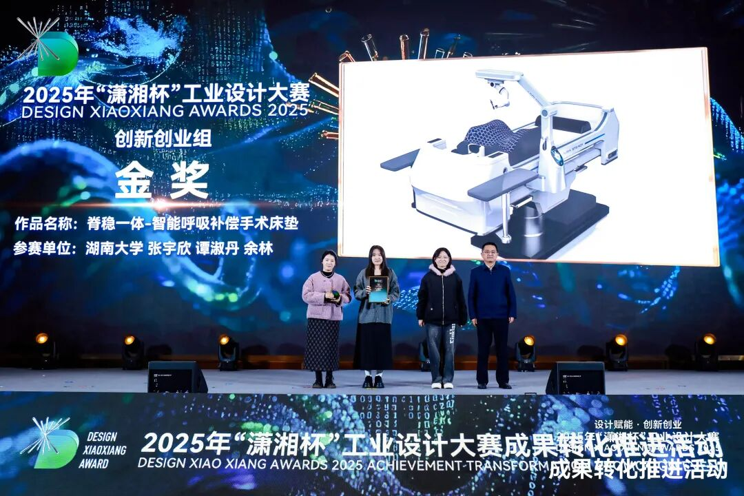 1月19日,2025年“潇湘杯”工业设计大赛成果转化推进活动在长沙举行。我校师生团队获创新创业组金奖1项、铜奖4项、优秀奖5项,学校获评创新创业组“院校优秀组织奖”。我校设计艺术学院与麒盛科技股份有限公司、长沙斐视科技有限公司、湖南维大开物科技有限公司等企业合作研发的3项智能产品分别获得产业设计组银奖、铜奖及优秀奖。