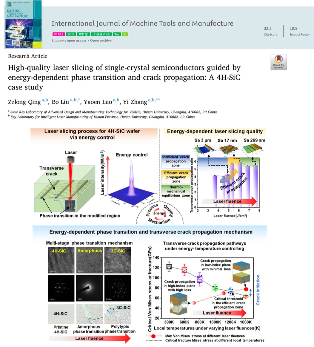 研究成果以“High-quality laser slicing of single-crystal semiconductors guided by energy-dependent phase transition and crack propagation: A 4H-SiC case study”为题发表在机械制造权威学术期刊《国际机床与制造杂志》(International Journal of Machine Tools and Manufacture)2026年第215卷上。湖南大学机械与运载工程学院为论文第一完成单位,张屹教授和刘播副教授为论文共同通讯作者,机械院博士研究生卿泽龙为论文第一作者。该工作得到了国家自然科学基金重点支持项目的资助。