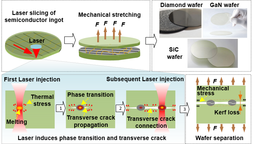 以碳化硅(SiC)、氮化镓(GaN)和金刚石为代表的第三/四代半导体具有高热导率、宽禁带等优异特性,已成为新能源汽车、智能电网等战略性产业的关键材料。在半导体器件成本中,晶圆衬底加工占比高达47%。这些材料的超高硬度与脆性导致传统机械切片面临材料损耗大(>40%)、效率低及机械损伤严重等问题,成为制约晶圆制造产业升级的关键瓶颈。激光切片技术为硬脆材料提供了非接触、高精度的新型加工方案,有望将材料损耗降低至10%以下。然而,该技术中激光与材料耦合引发相变并控制裂纹定向扩展的共性物理机制仍未突破,使得工艺优化长期依赖试错和经验,限制了新一代半导体晶圆制造水平的提升。