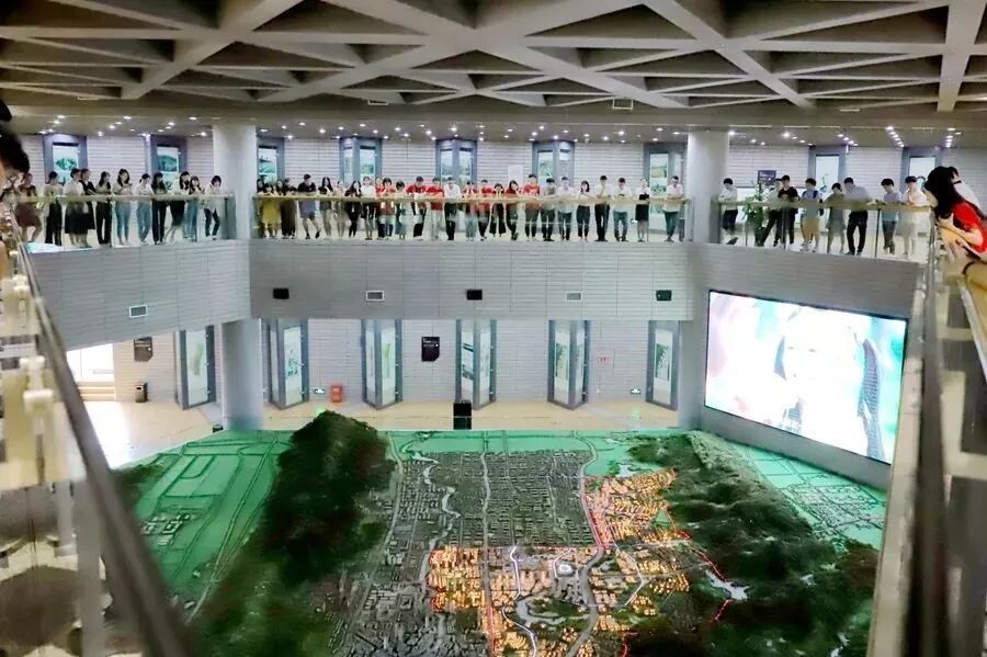 【璧山区规划展览馆里同学们在俯看沙盘】