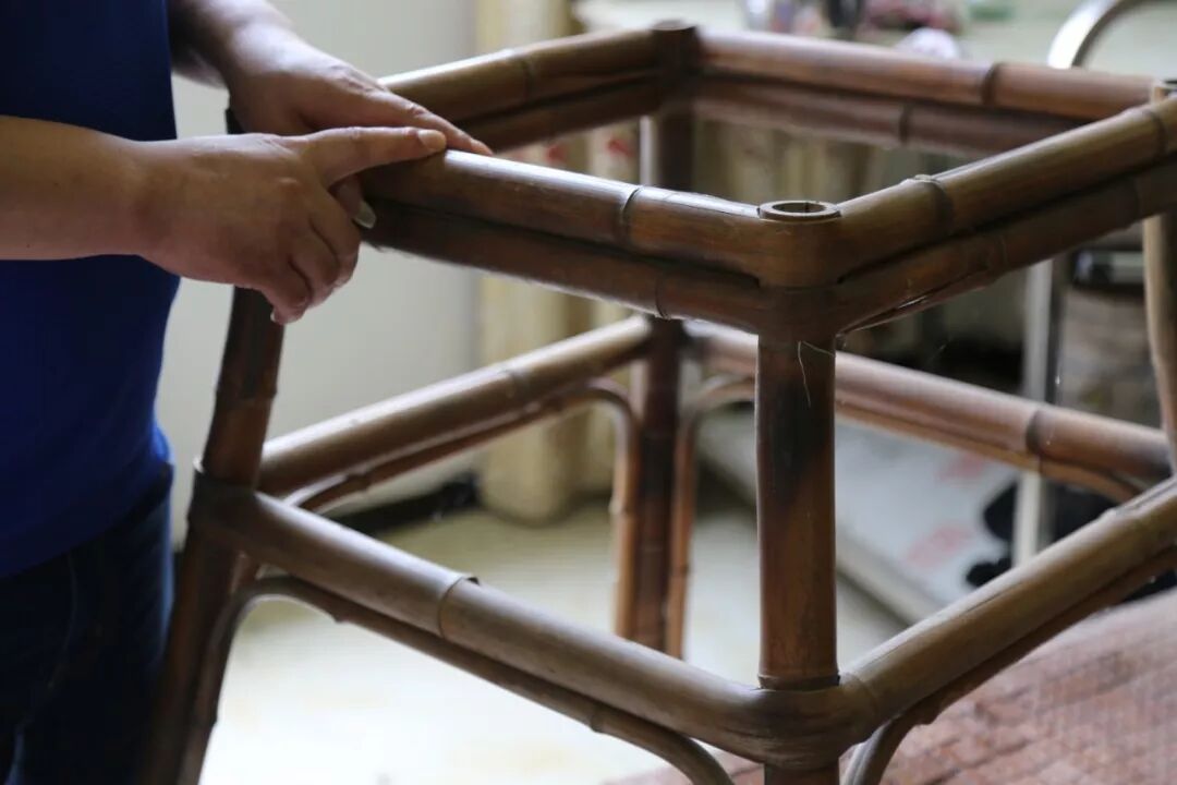 大郁制作的道道工序都是老祖宗传下的东西,承载着数百年来的文化血脉。然而在继承传统的同时,周师傅不囿于固有的技艺,而是与时俱进,对产品进行了精心的改良:沙发扶手上的菱形凹凸可以按摩手腕;外扩的桌角不仅是为了美观,更增加桌子的稳定性……对此,桃江县文旅广体局非遗中心办公室的刘勇华主任叹服道:“做竹子的很多,但这么有想法的还真只有他这一个。”