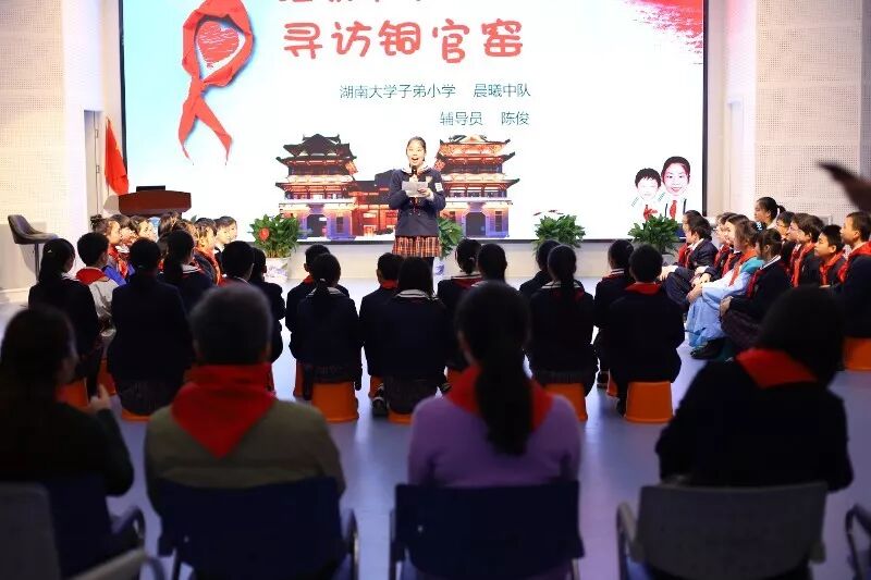 六(2)中队的队员们为考察团展示了红领巾小课题“铜官窑文化探秘”。孩子们妙趣横生的小品《长沙窑大唐造》一下子就抓住了现场来宾的目光。队员们分三个小队进行寻访活动,从课题发布,到前期调研、任务分配、课题调查、课题报告,都是队员们自主完成。