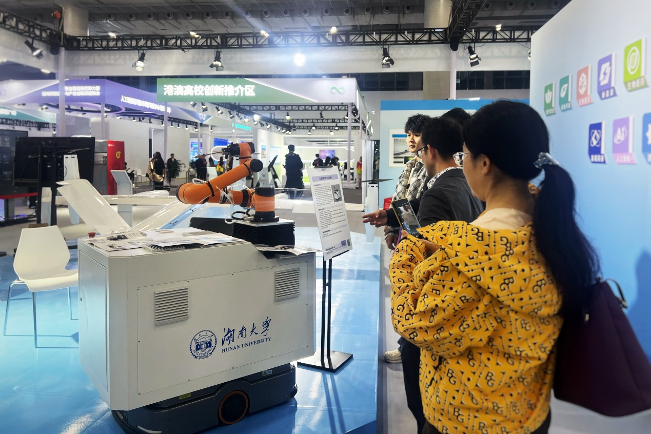湖南大学共有6个项目成果与孵化企业受邀参展。其中,孙炜教授团队研发的轨道交通设备清洁机器人入选成果超市展区。大湾区研究院孵化的具身智能机器人、高折光材料、高精度3D相机项目,以及麓光科技(广州)有限公司、广州麓智科技公司参会展出。