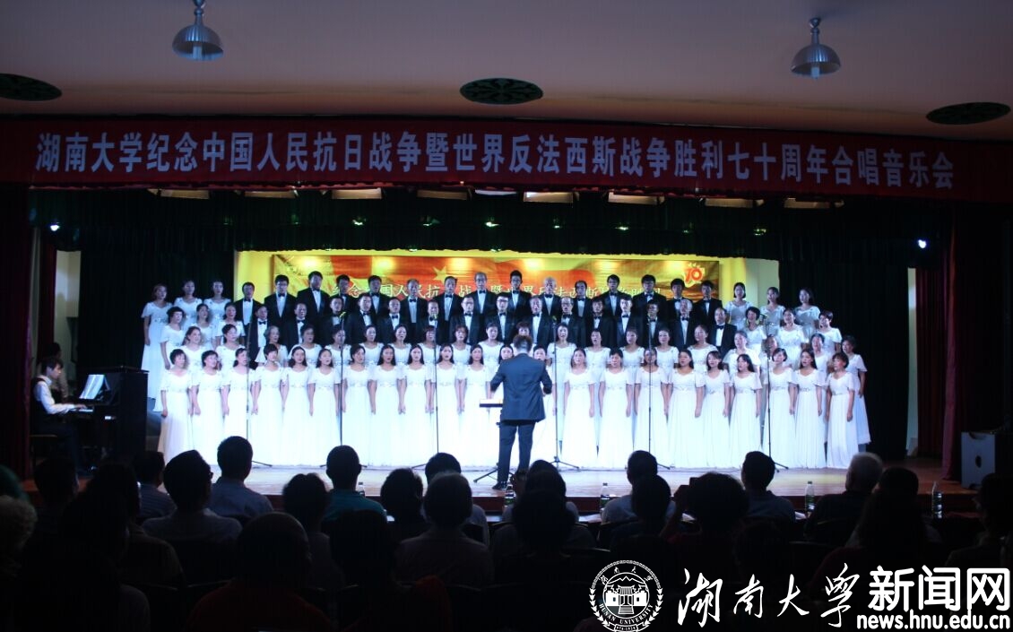 9月15日晚,湖南大学纪念中国人民抗战日战争胜利暨世界反法西斯胜利70周年合唱音乐会在北校区礼堂激情唱响。
