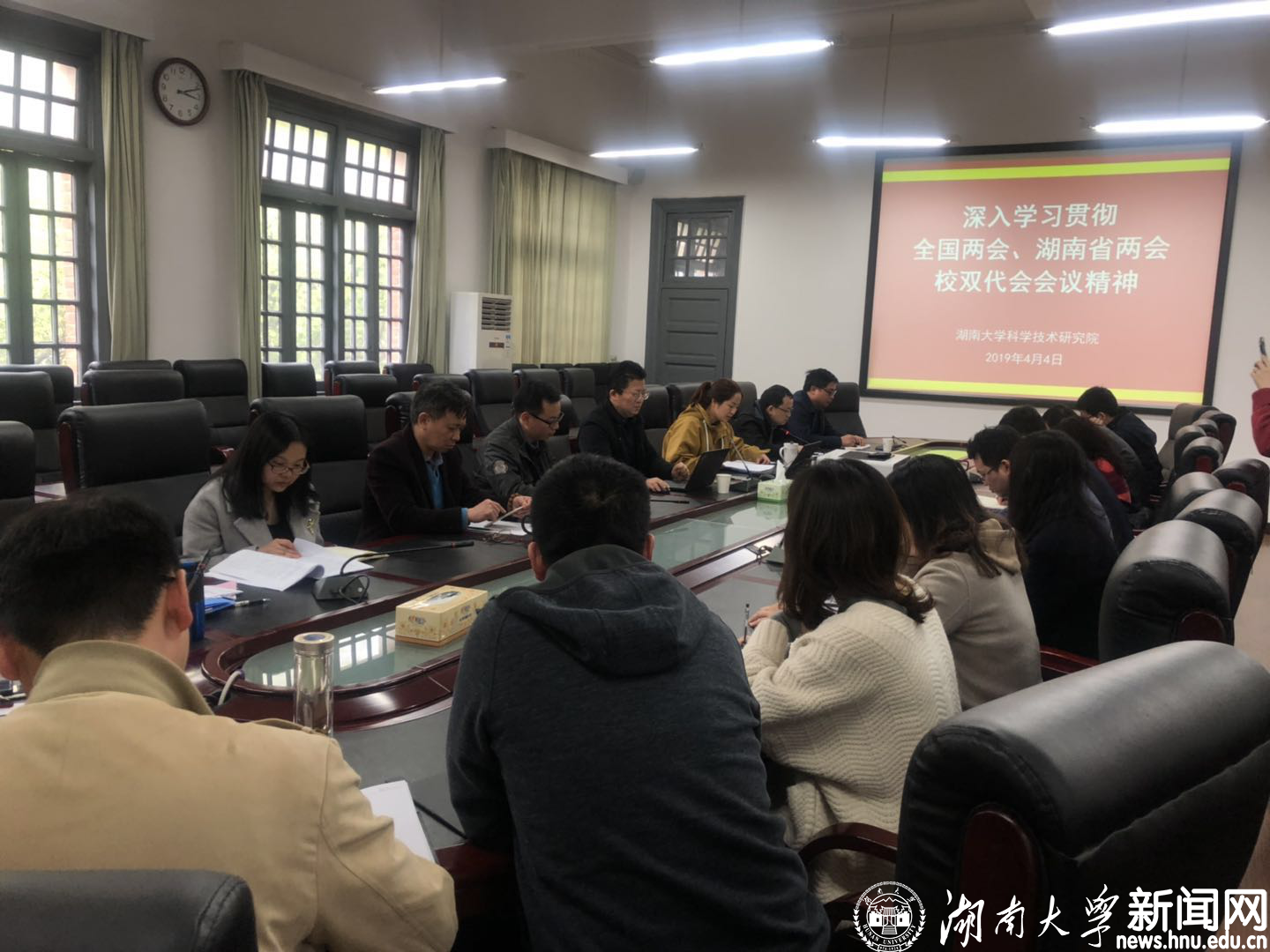 4月4日下午,科学技术研究院组织召开了深入学习贯彻国家两会、湖南省两会、我校双代会会议精神的学习交流会议。