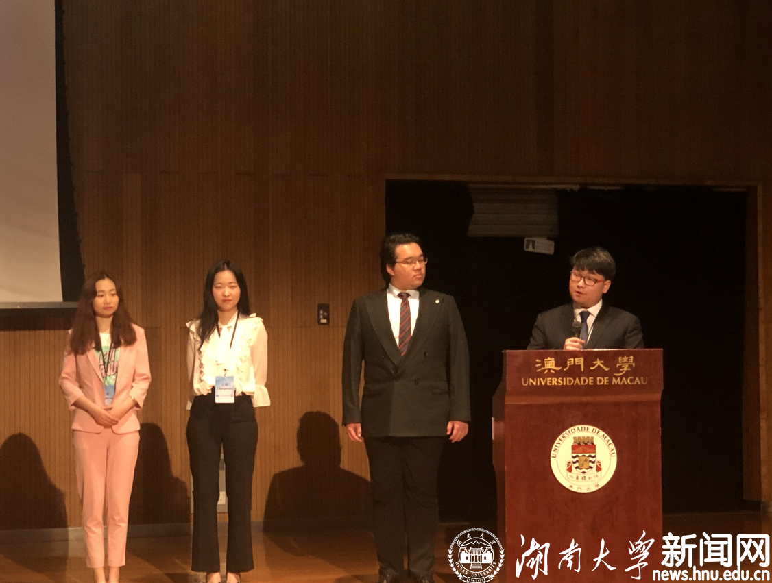 我院学子吴睿宸于开幕式进行委员会介绍(右一) 4月18日至22日,我院工商管理1702班学生吴睿宸受邀参加由澳门大学主办的第五届东亚模拟联合国大会(EastAsian Model United Nations Conference2019),担任“联合国教...