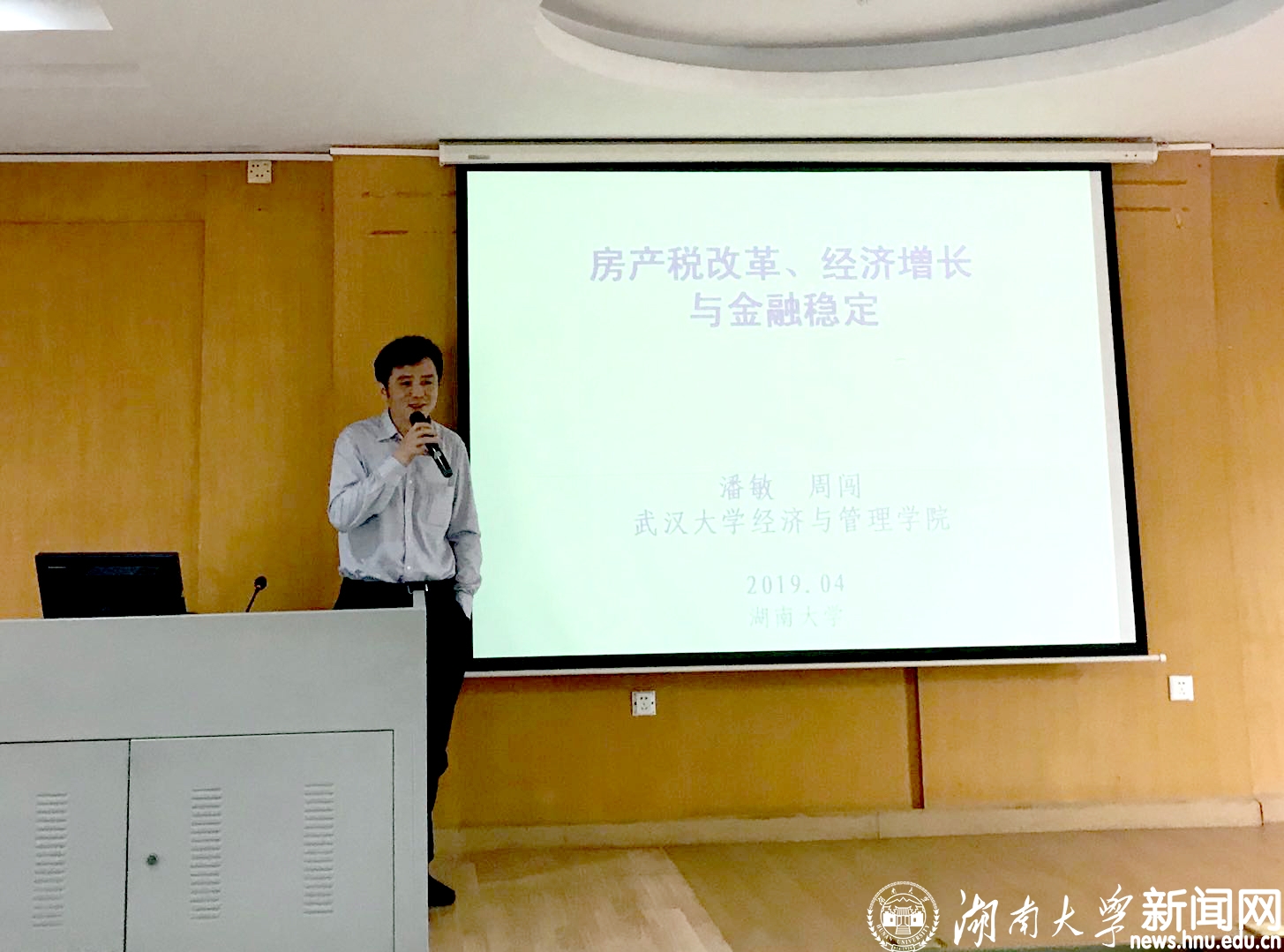 4月26日下午,武汉大学潘敏教授应邀来访金统院,于我校北校区行政楼开展了题为《房产税改革、经济增长与金融稳定》的学术讲座。