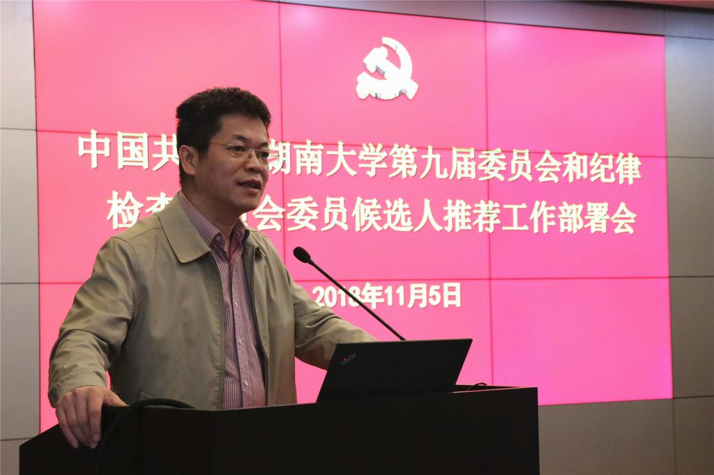 【湖大新闻】 11月5日下午,学校召开第九次党代会“两委”委员候选人推荐工作部署会,就“两委”委员候选人推选名额、推选原则、基本条件、推选程序和时间节点等事项进行部署和安排。