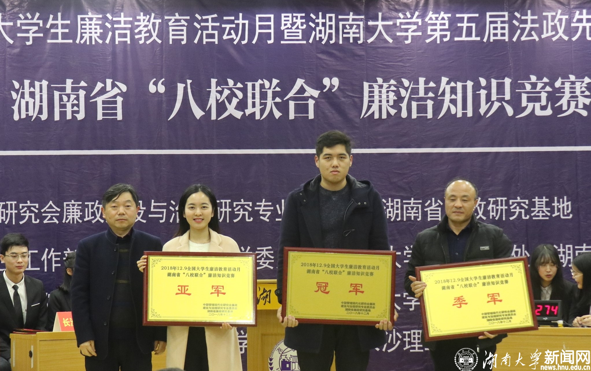 12月7日,2018年12.9全国大学生廉洁教育活动月暨湖南大学第五届法政先锋文化节系列活动之湖南省“八校联合”廉洁知识竞赛决赛在逸夫楼报告厅举行。