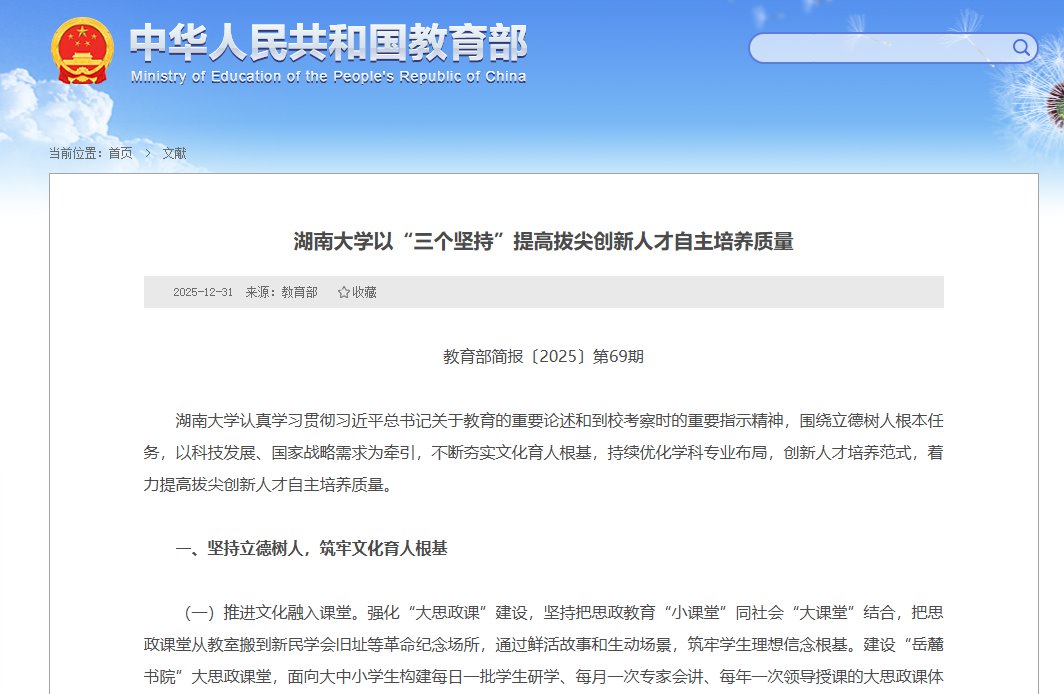 教育部简报〔2025〕第69期湖南大学认真学习贯彻习近平总书记关于教育的重要论述和到校考察时的重要指示精神,围绕立德树人根本任务,以科技发展、国家战略需求为牵引,不断夯实文化育人根基,持续优化学科专业布局,创新人才培养范式,着力提高拔尖创新人才自主培养质量。一、坚持立德树人,筑牢文化育人根基(一)推进文化融入课堂。强化“大思政课”建设,坚持把思政教育“小课堂”同社会“大课堂”结合,把思政课堂从教室搬...