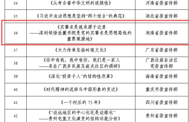 近日,经《湖南日报》自主申报、湖南省委宣传部审核推荐、中共中央宣传部集中评选,我校理论文章《实事求是就来源于这里——深刻领悟岳麓书院是党的实事求是思想路线的重要策源地》入选2025年度全国优秀理论宣传作品扶持计划,也是湖南省2025年度唯一入选的理论文章。该文由《湖南日报》整版刊载于2025年9月18日,系《湖南日报》“文史哲”理论专栏开栏首篇文章,作者系我校唐珍名研究员。该文紧紧围绕岳麓书院的“实事求是”是...
